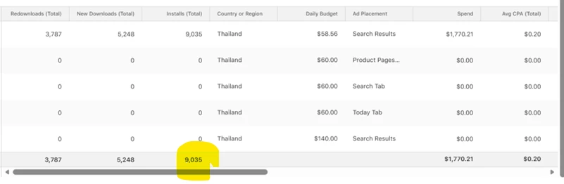 - Apple Search Ads dashboard: Installs (Total) = 9,035