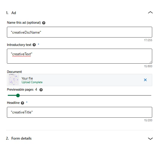 We love looking at ad-level performance of LinkedIn Ads--particularly being able to review messaging. We use “creativeTitle” and “creativeText” fields as dimensions, as well as “creativeDscName” to reflect the name of the ad variation and “creativeType” to reflect the ad format type. We don’t have any issues with the classic image or video ads, nor issues with these ad types that also employ Lead Gen Forms. However, if using the Document Ad type, which will often include a Lead Gen Form, no values return for these fields. The setup within the ads UI is very similar (screenshot attached). A value is entered for the “creativeDscName”, and values are entered for “creativeTitle” and “creativeText”. Is it possible to support these fields for the Document Ads type?