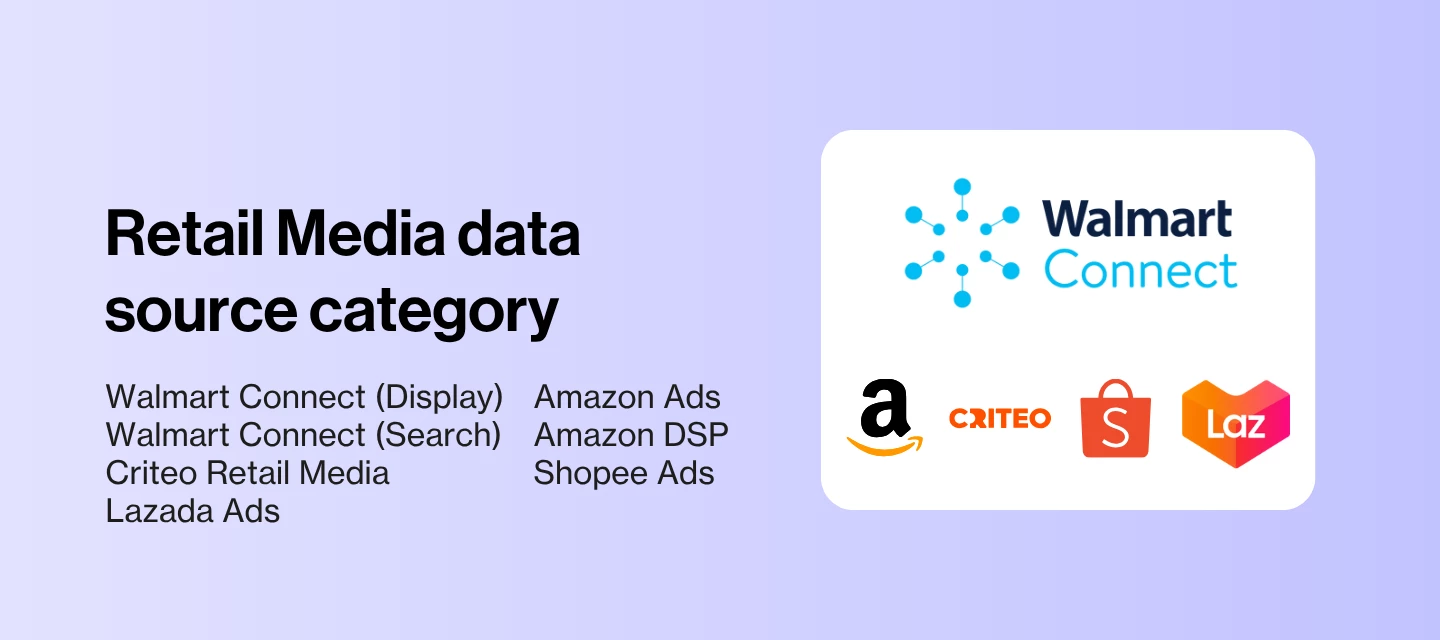 The new Retail Media data source category is here, simplifying your advertising analysis! This category brings together all your retail data sources, including Amazon Ads, Amazon DSP, Criteo Retail Media, Lazada Ads, and Shopee Ads. Our newest additions are Walmart Connect (Display) and Walmart Connect (Search). Now you have one central place to see ad performance and sales. You can easily combine this retail data with information from other marketing platforms—like Google or Meta—giving you a single, clear view of the customer journey and helping you make better investment decisions.